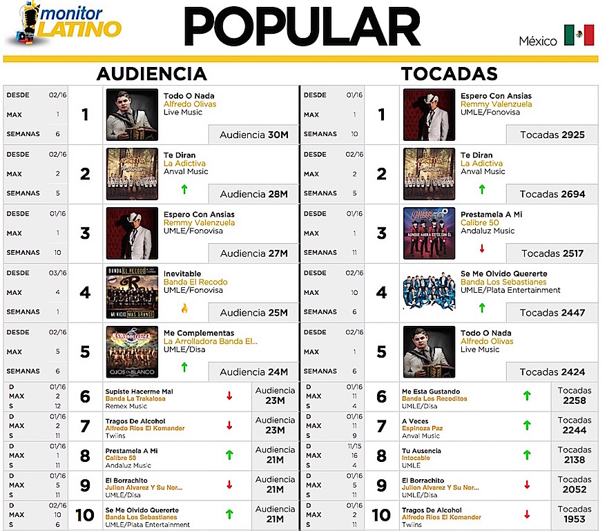 Semana del 16 de febrero de 2015 1.- Me sobrabas tu – Los Recoditos 2.- Dime – Julión Álvarez 3.- Lo Hiciste otra vez – La Arrolladora 4.- MaMeMiMoMu – Banda Rancho Viejo 5.- Broche de Oro – La Trakalosa 6.- A lo mejor – Banda MS 7.- Con 60 minutos – Pequeños Musical 8.- Hombre Sencillo – Banda Tierra Sagrada 9.- Mayor de edad – La original 10.- Contigo – Calibre 50 11.- Todo tuyo – Banda El Recodo 12.- Hombre Libre – La Adictiva 13.- Te extraño poquito – Claudio Alcaraz 14.- El que se enamora pierde – Banda Carnaval 15.- La Indicada – Kevin Ortiz 16.- Adicto a la Tristeza – Pancho Uresti Ft Trakalosa 17.- Vuelvo a nacer – Toño Lizárraga […]